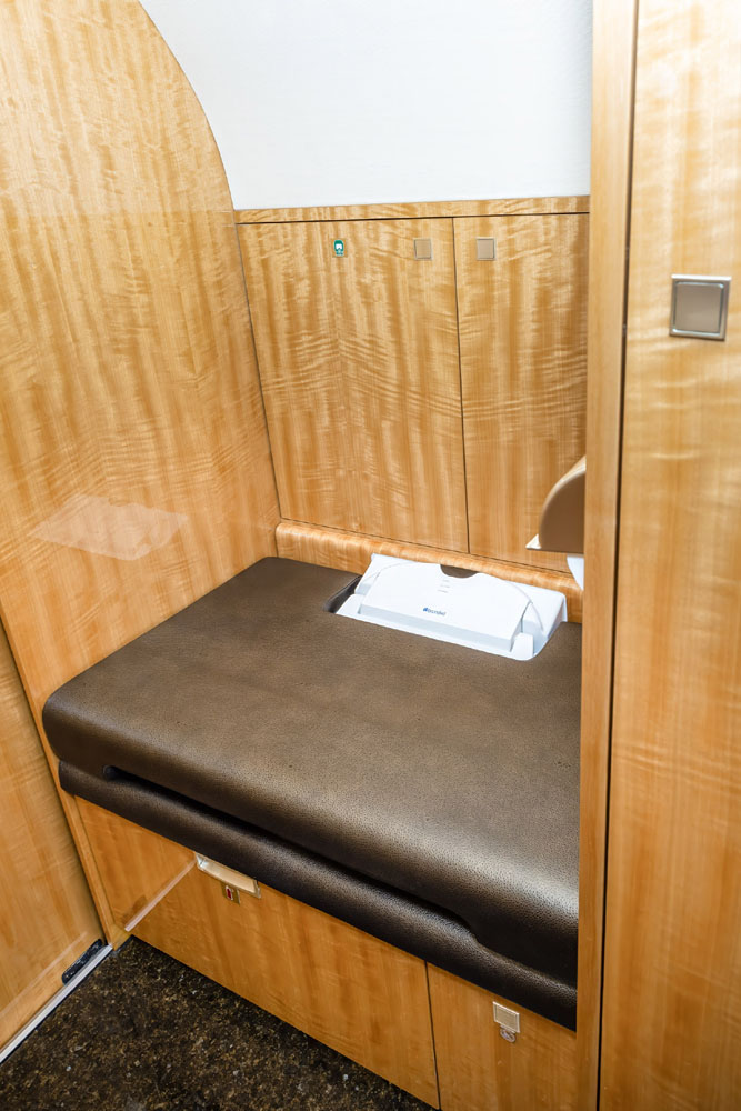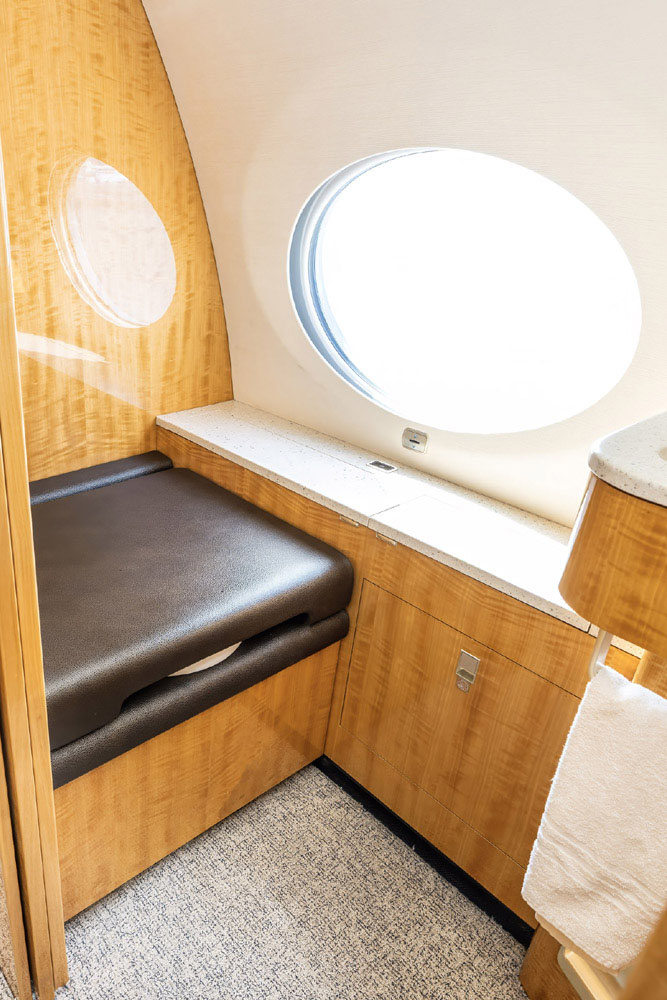 The forward cabin features two forward-facing powered seats with electric lumbar, electric legrest, electric 4-way height adjustment for base cushion, electric recline with berthing capability, memory pre-set, back cushion massage, and cushion heat. The cabin’s manual single seats and the crew compartment manual seat all have an adjustable seat pan, manual legrest, and electric lumbar. The cabin double seats have electric lumbar and drop-down inboard and center armrests. A removable panel in the forward righthand closet permits crew compartment seat full flat berthing. The two (2) 80” 3-place divans feature 39” berthing. An electrically operated console table with manual leaf is located at each club seating area, and a 3-position manual conference table is located at the mid-cabin conference group.
