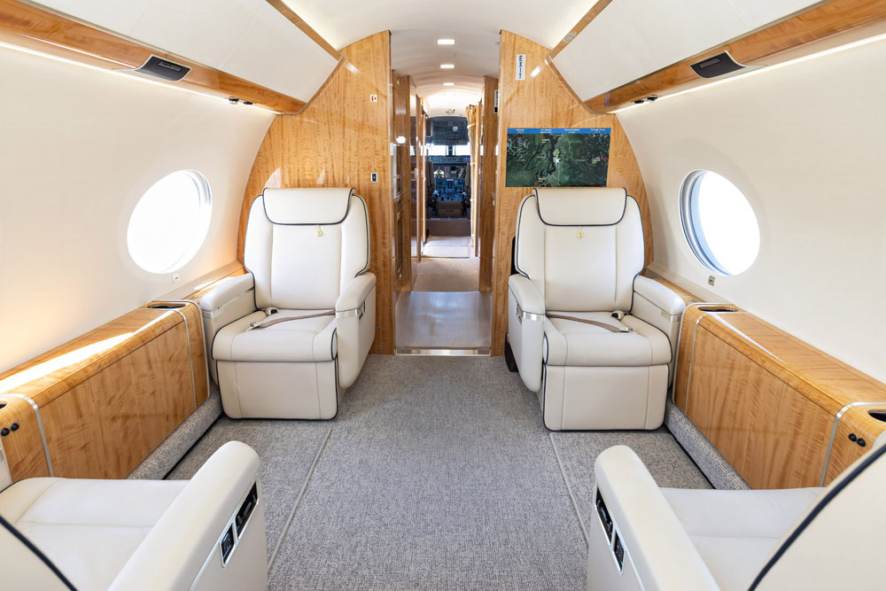 The Gulfstream Cabin Management System (GCMS) and Audio Video Distribution System (AVDS) include a variety of passenger controls providing access to cabin systems such as environmental, window shades, and entertainment. Cabin video equipment includes a dual-slot Blu-ray player with dual media servers, a crew compartment 17” widescreen HD LCD monitor, a forward right-hand cabin bulkhead 26” widescreen HD LCD monitor, and an aft cabin lefthand aft cabin bulkhead 26” widescreen HD LCD monitor. Entertainment includes a Gulfstream CabinView Flight Information System and an external standard definition camera system. The main cabin features 115VAC universal outlets, backlit USB charging ports, HMDI jacks, and electric window shades.